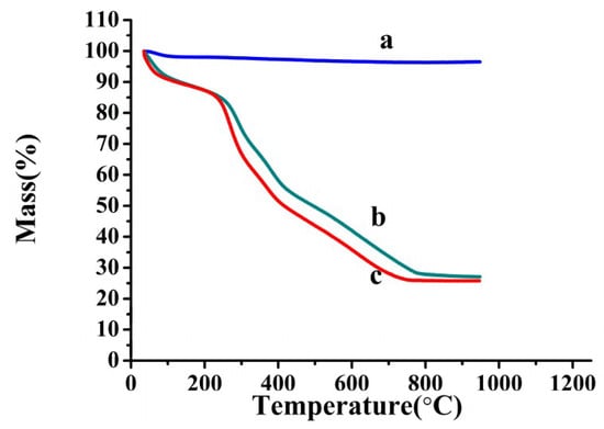 Thermogravimetric profile of: (a) Fe3O4@SiO2; (b) Fe3O4@CTS/SiO2 composite; and (c) Fe3O4@CTS/SiO2-C12 composite.