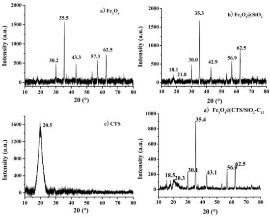 XRD analysis was conducted to verify the crystallinity of Fe3O4@CTS/SiO2-C12 composite. The XRD patterns of the resulting composite and the relevant materials were presented in Figure 4. The characteristic diffraction peaks of Fe3O4 nanoparticles were at 30.2, 35.5, 43.3, 53.6, 57.3, and 62.5° as shown in Figure 4a. These peaks could be assigned to [220], [311], [400], [422], [511], and [440] planes of magnetite, respectively. As seen in Figure 4b,d, these characteristic diffraction peaks of Fe3O4 both appeared at the similar position in comparison to the peaks of the raw Fe3O4 nanoparticles. The result revealed that the surface coating cannot lead to the phase change of the magnetic core. On the other hand, the diminished peak intensity of chitosan at 20.3° and silica at 18.5° in the resulting composite shown in Figure 4d represented that the interaction between chitosan and silica caused an amorphous structure of the coating.