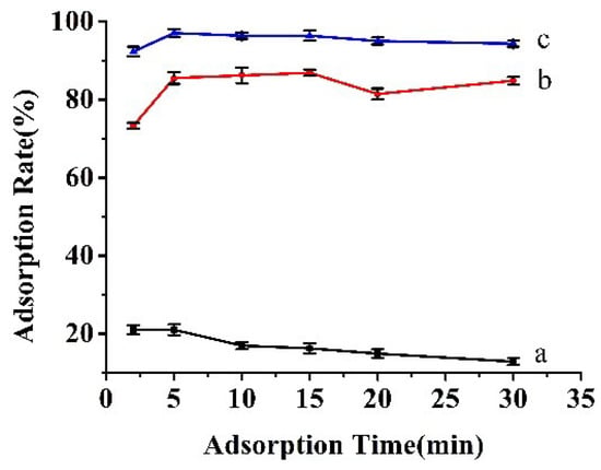 The influence of different alkyl groups on the adsorption. (a) Without any modification; (b) Octyl modification; (c) Dodecyl modification. 50 mg adsorbents in 10.0 mL solution (10 mg/L BPA); 34 mmol/L PBS, pH 7.0; 25 °C. The error bars represent standard deviation of three parallel experiments.
