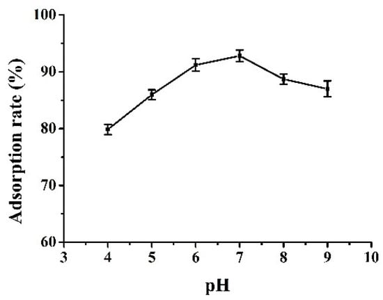 The pH value of solution is an important factor in the adsorption process. The change of pH can affect not only the surface properties of the resulting composite but also charge properties of adsorbate in aqueous phase. From the results presented in Figure 6, the adsorption efficiency of Fe3O4@CTS/SiO2-C12 composite for BPA increases gradually in the pH range from 4.0 to 7.0. The maximum adsorption rate of BPA is achieved at pH 7.0. A decreasing tendency of the adsorption efficiency can be observed when the pH value exceeds 7.0.