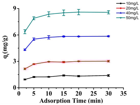 The kinetic curves of BPA adsorption on Fe3O4@CTS+SiO2-C12 composite were obtained at different initial BPA concentration as shown in Figure 7. The adsorption capacity increased with increasing the initial BPA concentration. A average maximum adsorption capacity of 8.7 mg/g can be reached with the 50 mg/L initial concentration. Furthermore, rapid adsorption was observed and the equilibrium could be attained at around 10 min. It indicated that the adsorption sites of 50 mg prepared composite are abundant for the adsorption even at higher concentrations of BPA.