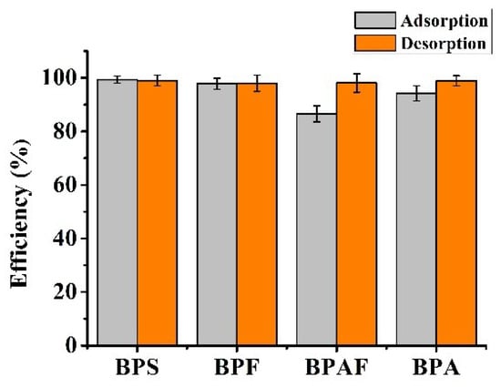 The enrichment performance of BPA, BPS, BPF, and BPAF on Fe3O4@CTS/SiO2-C12 composite. 50 mg adsorbents in 10.0 mL solution (each 0.5 mg/L); 34 mmol/L PBS, pH 6.0; 25 °C.