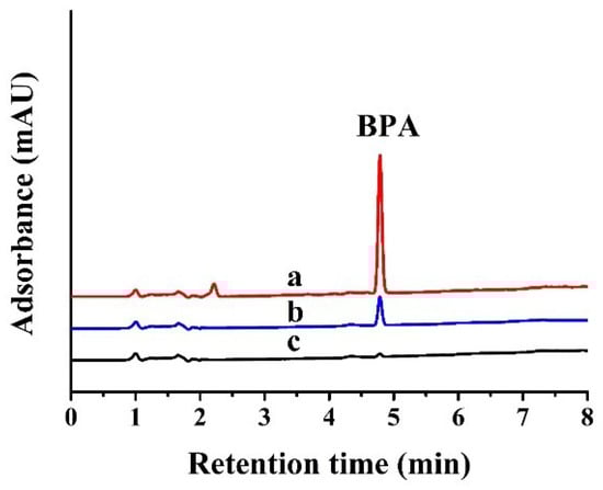 The HPLC-DAD chromatograms of BPA obtained from: (a) 2 mL eluent after elution; (b) direct injection of the BPA solution; (c) the BPA solution after adsorption; 50 mg adsorbents in 10.0 mL solution (1 mg/L BPA) The optimal conditions were used.
