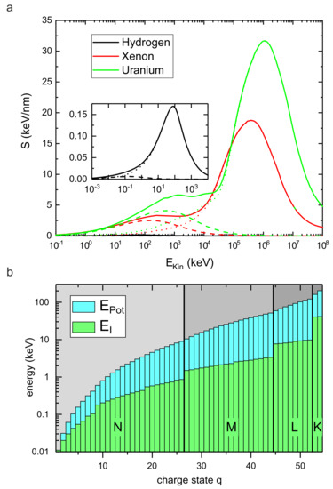 For practical calculations of the energy deposition by ion irradiation, a software package SRIM (The Stopping and Range of Ions in Matter) was developed by Ziegler et al. [37]. Figure 1a shows the two contributions to the total stopping as a function of the projectile’s kinetic energy for the case of hydrogen, xenon, and uranium, respectively, penetrating graphite (density ) as calculated by SRIM. The dependence on and on the mass of the projectile is clearly seen.
