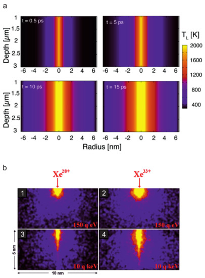 which is the sum of the ionization energies of the detached electrons and thus depends on the charge state q, see Figure 1b. The achievable energy densities are comparable to or may even exceed those achieved by SHI, because in the case of HCI the energy is deposited into a very small volume near the surface (see Figure 2b). This is not only due to the lower kinetic energy of HCI with respect to SHI, but also related to its specific interaction with the target material: Upon approach, an image charge builds up in the target material. For a metal, this image charge in turn increases the kinetic energy of the projectile by , where W is the work function of the target material. As soon as a critical distance is overcome [40], charge transfer sets in releasing the potential energy stored in the projectile. The HCI is neutralized by the captured electrons which are occupying predominantly high-energy Rydberg states. The relaxation of this hollow atom proceeds via a number of processes like Auger and quasi-resonant neutralization, Auger and resonant ionization, and radiative de-excitation.