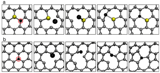 Ab initio molecular dynamics simulations of atom-number-conserving transformations in graphene. (a) Migration step of a Si impurity atom caused by an electron impact on its neighboring carbon atom (marked with a red circle). (b) Stone-Wales transformation caused by an electron impact on one of the carbon atoms (marked with a red circle). From Ref. [64].