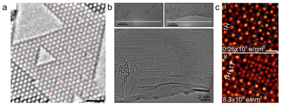 In contrast to graphene, in other 2D materials, bond rotation-type transformations are rare (but in some cases possible [65]), and the creation of vacancy-type defects is the most prominent structural change under electron irradiation. For example, in h-BN, electron irradiation leads to the formation of nitrogen-terminated triangular pores [52,66,67] (see Figure 5a). For transition metal dichalcogenides (TMDs), chalcogen vacancies are the most observed defects, often arranging into line defects [68] (see Figure 5b). A commonly observed structural change in TMDs is a local phase transition [69,70], typically between the 1H and 1T phases (see Figure 5c).
