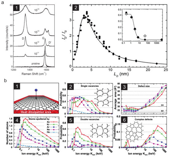 The findings of Lucchese were not per se related to defect engineering, but established nevertheless an important tool for 2D material science. Their work demonstrated that the so-called Raman D peak, which in any sp-coordinated graphitic system only occurs if otherwise symmetry-forbidden scattering processes are activated due to the presence of defects [73], clearly increases with increasing ion fluence up to a total fluence of ca. ions per cm, see Figure 6a. Accordingly, with respect to the defect density the quality of any graphene sample may be conveniently assessed by Raman spectroscopy. Later on Eckman et al. tried to also characterize the type of defect by Raman spectroscopy [74] which however proved to be much more difficult.
