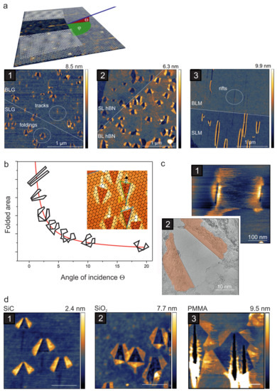 The first experiments studying the effects of SHI irradiation on 2D materials were conducted with individual SHI impinging on graphene in a grazing incidence geometry. Akcöltekin et al. irradiated exfoliated graphene with 90 MeV Xe ions at an incidence angle of with respect to the surface and investigated the samples by means of AFM [111]. They found unexpected and very characteristic morphological changes which turned out to be foldings of graphene. This is shown schematically in Figure 8a where foldings in graphene, hBN, and MoS are shown as well; note that a single ion has caused each of these massive structural changes involving hundreds of atoms.