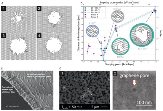 A direct application of the defect engineering capabilities of SHI is easily found in the field of ultrafiltration as they offer a unique approach. Because of their extended range in solid matter (see Equation (6)), SHI can be used to drill a hole into graphene and the supporting polymer membrane all at once, i.e., in the same irradiation step. In contrast to other approaches based on low-energy ions (see Section 3.2) the polymer pores are widened only after the irradiation in a subsequent etching step which leaves the graphene pores unaffected. This concept has been recently successfully implemented [126,127], see Figure 9c,d.