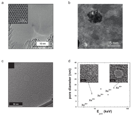 with electron-phonon coupling constant g, electronic and thermal conductivity as well as electronic and thermal heat capacity . They found that supported graphene sustains damage by individual SHI impacts above a threshold of keV/nm, although mainly due to pressure waves of the graphene/SiO system evolving from the impact volume, which again underlines the importance of the substrate. The defect structures in the graphene layer modeled with MD were nanopores, the size of which scales with the stopping power and is on the order of a nanometer (Figure 9a). For suspended graphene, the authors mention that it sustains extended damage for larger than a critical value of 8 keV/nm. According to this work, a few hundred carbon atoms can be easily removed per SHI, details of the resulting defect type and size were however not presented.