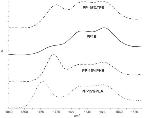 Through the FTIR technique, biodegradable materials can be easily detected in the recycled PP, since, as it was demonstrated in our previous work, some of the characteristic bands of the biodegradable polymers (PLA, PHB and TPS) do not overlap with the PP characteristic bands [38]. As shown in Figure 2 between 1700 and 1800 cm−1, the PP/biodegradable polymers blends (with 15 wt.% of the different biodegradable polymers) exhibit a strong band that has no presented the neat recycled PP. This is due to PLA and PHB present the carbonyl group (–C=O) characteristic band at this wavelength. The asymmetric stretching of the carbonyl group in neat PLA is at higher wavelength (1754 cm−1) and it is attributed to the amorphous carbonyl vibration. Meanwhile, the stretching vibration of crystalline carbonyl groups is centered at lower wavelengths (1726 cm−1) in the spectrum of neat PP-15%PHB associated with the crystalline state of PHB [45]. TPS presents the same band due to the additives used for their manufacturing in the thermoplastic form [38]. Although FTIR technique does not allow to quantify the amount of biopolymer in the blends, it represents a simple and fast method to detect the presence of this kind of impurities in the recycled PP process which is easily scalable up to the plastic recycling industry.