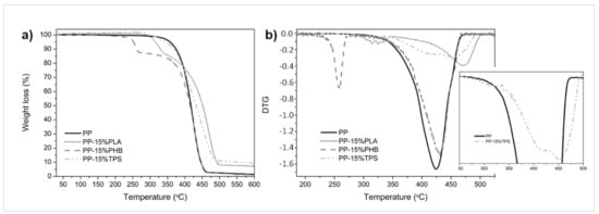 (a) TGA and (b) DTG thermograms of PP blends with 15 wt.% of biodegradable polymers.