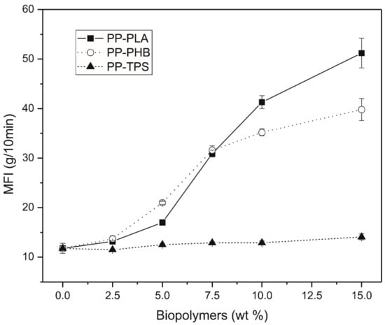Figure 5 shows the graphical representation of the melt flow index (MFI). It can be seen that the TPS does not significantly modify the MFI of the PP, since it practically remains constant for all the percentages studied, despite being the polymer with the farthest solubility value compared to PP. In the case of blends made with PP with PLA or PHB, it is observed that the MFI increases as the percentage of biodegradable polymer in the blends increase. This increase is more pronounced for the samples made with PLA. Nevertheless, blends prepared with low amount (2.5 wt.%) of these biodegradable polymers, that is PP-2.5%PLA and PP-2.5%PHB, MFI is not practically affected. This could be related with the fact that increasing the polyester amount in the blend, the amount of ester groups, which are relatively easy to breakdown and have poor thermal stability [50], increases and more chain scission occurs leading to an increase in MFI.