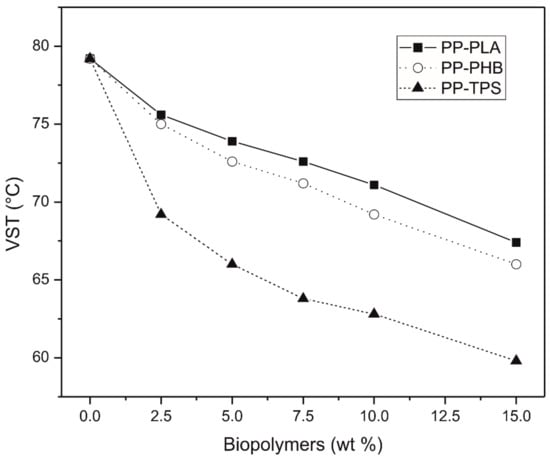 The blend thermal stability was studied by determining the softening temperature VICAT (VST). The results for all the studied systems, PP-PLA, PP-PHB and PP-TPS, show the same behavior, since as the amount of biodegradable polymer increases it causes a decreases of the VST (Figure 6). Depending on the system, the decrease of this property is more or less pronounced. While the PP-PLA blend system is the one with the highest VST (lower VST reduction), TPS is the biodegradable material that causes a greater decrease of this property. This behavior could be related to the fact that starchy materials are water sensitive and are able to show a rubber-like behavior depending on its moisture content [51].