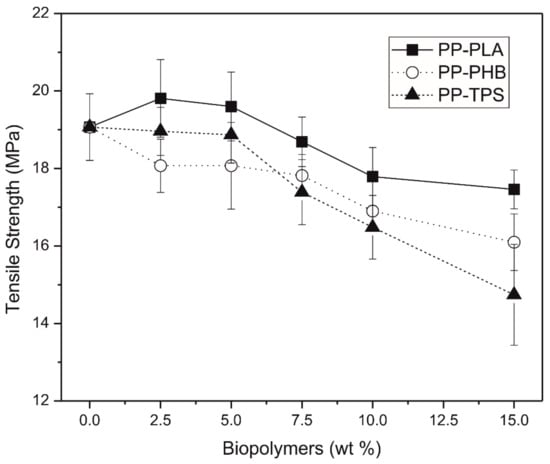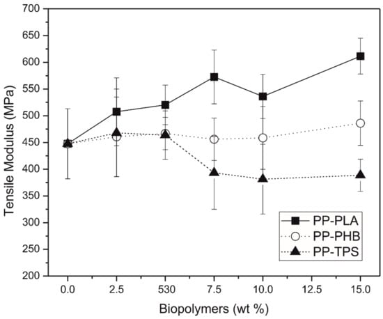 The graphical representation of the tensile modulus (Figure 8) shows that the variation of this property depends on the biodegradable polymer used in the blend. In blends made with PP-TPS it is possible to observe that the elastic modulus remains constant when the amounts of TPS added are lower than 5 wt.%. For higher values it can be seen that the modulus decrease considerably up to 400 MPa. In the PP-PHB blends the modulus remains practically constant around 450 MPa for all the percentages studied, this may be because the PHB has an elastic modulus similar to that of the PP [52]. On the other side, in PP-PLA blends, it can be observed that the elastic modulus increases as the PLA content increases from around 450 for recycled PP to around 610 MPa for PP-15% PLA, this increase may be due to the fact that PLA possess a higher elastic modulus than PP [53].