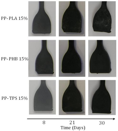 Unfortunately, instead of reaching the recycling system, several PP-based products still go to landfill after their useful life, and thus in order to simulate this end of life option the materials were exposed to composting conditions at laboratory scale level. It is known that PLA, PHB or starch-based materials are totally disintegrated under composting medium exposed to thermophilic aerobic conditions [21,47], that is according to the ISO standard in less than three months [39]. In fact, blends containing PLA, PHB or TPS in their formulations requires between one and two months to be completely disintegrated under composting [54,55]. Meanwhile, since PP is not a biodegradable polymer it is not suitable to perform disintegration in a composting medium. Thus, the PP blends were subjected under controlled composting conditions during 1 month. The visual appearance of recovered samples at different time of exposition in composting conditions (8, 21 and 30 days, on the basis of previous work [38]) are shown in Figure 8. It was observed that the samples suffered somewhat physical changes at the surface after 21 days and mainly after 30 days, suggesting that the biodegradation of PLA, PHB and TPS is taking place. Therefore, TGA analysis were conducted to follow the loss of biodegradable materials during composting exposition as it was previously reported for polystyrene/biopolymers blends [38]. In Figure 9 are shown the TGA and DTG curves of PP-15%PLA (Figure 10a,b), PP-15%PHB (Figure 10c,d) and PP-15%TPS (Figure 10e,f) before and after 30 days exposed to composting conditions. As it was already commented in TGA results, in the case of PP-15%PLA and PP-15%PHB blends the thermal degradation takes place in two-step process in which the first step is related with the loss of the biodegradable material, PLA or PHB, and the second one corresponds to the degradation of the PP. After 30 days in composting the onset degradation temperature of PP-15%PLA blend was considerably reduced (Figure 10a), since the disintegration of PLA is taking place and thus there are shorter PLA chains, such as oligomers, which present lower thermal stability [13], which degrade faster than longer PLA polymeric chains. Similarly, the maximum degradation temperature corresponding to PLA (TmaxPLA) at about 325 °C was shifted to 289 °C after 30 days (Figure 10b). The second maximum degradation temperature of PP-15%PLA was about 472 °C before composting, while after 30 days in composting it was shifted towards lower temperatures (462 °C) approaching to that of PP because there is less PLA impurities in PP matrix at this composting stage. In the case of PP-15%PHB (Figure 10c) the onset degradation temperature was shifted to higher temperatures, since PHB has lower thermal stability than PP. The maximum degradation temperature of PHB (TmaxPHB = 257 °C) was shifted to higher values during composting reaching 270 °C after 30 days (Figure 10d), because of the blend behaves more similarly to PP while it loss the PHB. Similarly, the second maximum degradation was shifted from 430 °C to 442 °C during composting. Finally, for PP-15%TPS the thermal degradation take place in only one step and the onset degradation temperature was around 346 °C in PP-15%TPS blends (Figure 10e) and this value was maintained after 30 days in composting. Nevertheless, the shoulder observed just before the maximum degradation temperature corresponds to the cleavage of ether linkages in starch backbone of TPS [47] and it was slightly reduced (Figure 10f). Meanwhile, there was a second peak at higher temperatures, at about 450 °C in Figure 10f, which was shifted to 465 °C after 30 days in composting. The displacements of the maximum degradation temperatures were more pronounced in the case of PP-PLA and PP-TPS blends, since there were less amount of biodegradable material in both formulations after the exposition to the composting medium. Meanwhile, the more crystalline PHB was less disintegrated at this stage of disintegration. However, it should be mentioned that in all cases still remains biodegradable polymer in the formulations, showing that PP can limit the exposure of biodegradable polymers to the composting degradation suggesting that there is somewhat positive interface interaction between PP and biodegradable materials as it was observed in TGA result (Section 3.3.1) and/or the blend separation is forcing a discontinuous disintegration, and thus, biodegradable materials are less available for the hydrolysis and the further microorganisms attack in the composting medium.