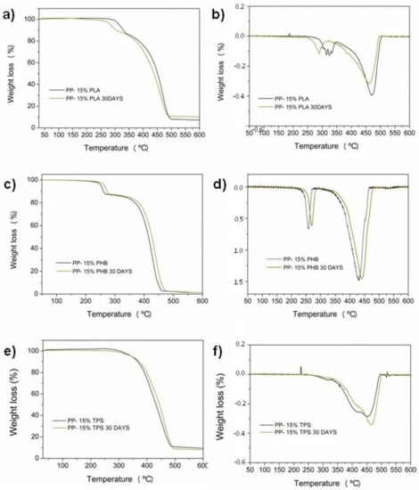TGA (a,c,e) and DTG (b,d,f) thermograms of PP- biodegradable blends before and after 30 days exposed to a composting medium.