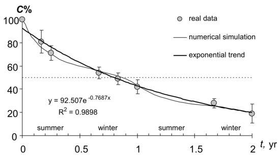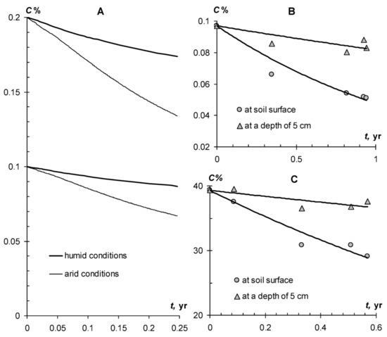 In the first (linear) approximation, the following model for the destruction of organic matter with a concentration (inventory) (C, kg/m2) and a flux (input) on the surface (L, kg·m−2·year−1) can be used for this purpose [6,7].