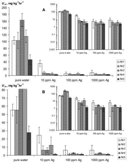 The change in Um of hydrogels and gel compositions with silver in the case of mixing of root rot and sandy substrate; №№1–4 are different types of hydrogels (see “Objects and methods”); (A) is ionic silver and (B) colloidal silver; insets are semi-logarithmic scale.