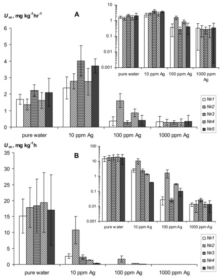 Introduction of silver inhibitors of the biological activity significantly reduces respiration and biodegradation in pure gel-silver compositions (Figure 3 and Figure 4). In the case of silver ions under the action of a dose of 10 ppm Um decreases at 13–30 times. The exception is the gel Aquasorb where Um is reduced to not more than three times. Doses of 100–1000 ppm inhibit Um 20–60 times without significant differences on the effects between them. As the result calculated values for the effective half-lives T0.5 increase to 5–30 years in SSPH compositions with 10 ppm Ag and up to 25–50 years when the content of silver ions ranges from 100 to 1000 ppm. Silver nanoparticles have the same or a somewhat greater inhibitory effect. At the dose of 10 ppm Ag the value Um is equal 6–25 mg∙kg−1∙h−1 and T0.5 varies from 6 to 20 years, and at doses of 100–1000 ppm Um is equal 1.8–2.8 mg∙kg−1∙h−1 and T0.5 = 24–105 years.