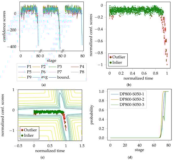 Exemplary procedure of the anomaly detection pipeline based on DP800-S050: (a) Confidence scores per patch including the average of the patches of each of the three trials; (b) Combined confidence scores of the previous trials with normalized time and scores; (c) Confidence scores with negative log. likelihood space of the modeled GMM; (d) Average probability of being an outlier over time and its progression for each individual trial of DP800-S050.