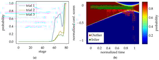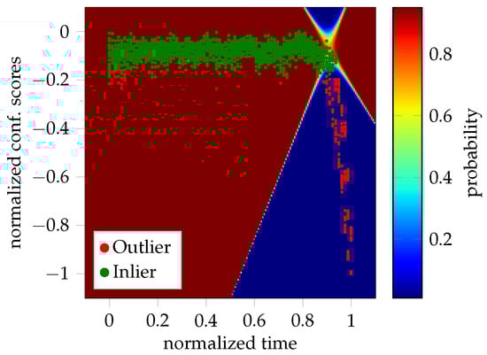 As mentioned, the onset of necking is expected to occur in the elbow region of the curves depicted in Figure 2, while still being considered as inlier. This is visualized by Figure 3, where the color-coded probability helps to depict the transition from the homogeneous to the inhomogeneous forming phase.