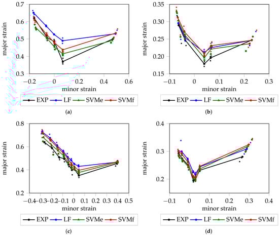 Deterministic FLC in relation to the “line-fit” method and experts’ decisions: (a) DX54D (2.00 mm); (b) DP800; (c) DX54D (0.75 mm); (d) AC170.