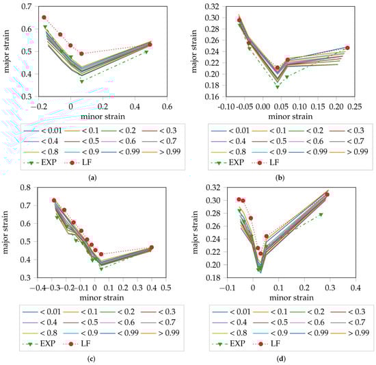 Probabilistic FLC in relation to the “line-fit” method and experts’ decisions: (a) DX54D (2.00 mm); (b) DP800; (c) DX54D (0.75 mm); (d) AC170.