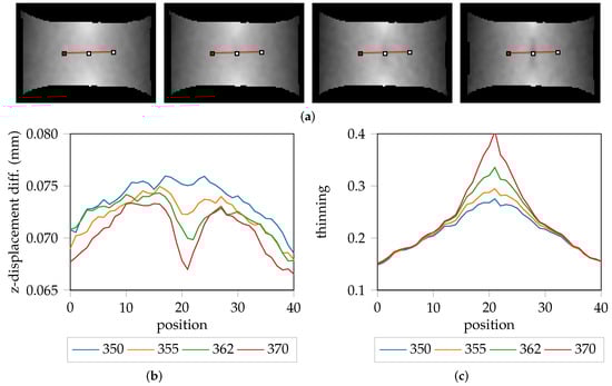 The hypothesis that the “line-fit” method overestimates the onset of localized necking is supported with the evaluation of the z-displacement differences of DX54D (2.00 mm)-S030-1 as visualized in Figure 7a. In this trial, the “line-fit” method returns stage 370 as the onset of necking. However, this seems to be optimistic as already some reduction of sheet metal thickness along the z-axis is already visible as shown in Figure 7a (right). Investigation of the earlier stages revealed that some reduction in sheet metal thickness was already present at stage 355. Consequently, the z-displacement of specimen is a valuable source of information that could be exploited when evaluating ductile materials. This is further emphasized by the z-displacement cross-section profiles depicted in Figure 7b. Additionally, Figure 7c depicts the corresponding cross-section profiles of the strain distribution.