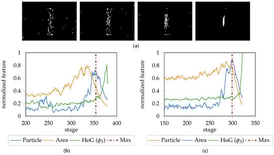 Evaluation of the thresholded area progression in relation to the HoG feature: (a) Concentration and increase of the thresholded area of DX54D (2.00 mm)-S030-1 of difference images at stage 300, 330, 360 and 370. First the area above the 0.9 threshold is spread over the whole image before concentrating to a single particle; (b) Progression of the size of the thresholded area of the whole image (orange) with respect to progression of the size of the largest connected particle (blue) and the progression of the HoG feature of DX54D (2.00 mm)-S030-1 (Green); (c) Corresponding information based on DP800-S050-1. After reaching the maximum possible connected particle size, no further forming is possible, leading to an increasing gradient in various HoG. bins, depending on the underlying geometry.