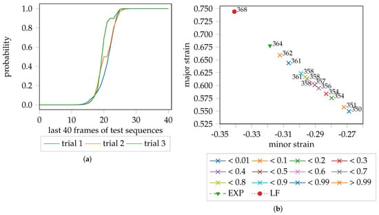 Leaving aside the actual evaluation area and hence the actual major and minor strain pairs, the point in time when necking is detected, can be compared. As the present study combines three trials for each geometry to determine the probabilistic FLC candidate, the average time over three trials is depicted in Figure 9b for each quantile. There is a probability of <1% that necking is initiated before stage 350. This increases to a 50% probability by stage 356 and is >99% at stage 362. The “line-fit” method for DX54D (2.00 mm)-S030-1 suggests stage 368 to be the onset of necking on average, whereas the majority of experts from Part 1 identified stage 364, which is reasonable as they concentrated on finding a sudden increase of strain from one image to the other based on cross-sections through the strain distributions. The multiple time points in Figure 9b are a result of the variation in the slopes of the probability progression curves, per trial, as depicted in Figure 9a. As the trials have different lengths, the image only contains the last 40 frames of the test set per video sequence and trial.
