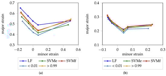 A graphical representation of the deterministic FLC for each material is visualized in Figure 5. Within all materials with the exception of DX54D (2.00 mm), SVMf shows high consistency with the “line-fit” method, which is reasonable as both strategies evaluate comparable information domains and make use of the difference between consecutive images. As expected, the SVMe estimate is consistently below that of SVMf, for all materials, as an earlier point in time is used to look up the strain value pairs. Especially in case of DP800, the three candidates, SVMe, SVMf and “line-fit”, are close to each under uniaxial loading conditions. For DX54D (2.00 mm), the rather large gap between the “line-fit” method and the SVM results may be a consequence of the rather low sampling frequency, or due to the different evaluation areas used to determine the onset of necking. There is high agreement between the SVMe results and the experts’ annotations from Part 1, with the latter being marginally below the former, for all materials with the exception of the uniaxial loading conditions of DX54D (2.00 mm). This means, that the experts consistently decided to select an earlier stage for the onset of necking based on the original strain distributions. This seems reasonable as the experts were looking for early sudden increases the strain distribution from one stage to the other.