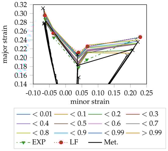 A quantification of the method can be achieved with the analysis on the material behavior using metallography. In [11], a metallographic analysis of a DP800 at several forming steps and different strain paths using Nakajima tests has been presented. This analysis of the surface and thickness pointed out that the onset of necking for this dual-phase steel starts on the surface with micro-cracks that are metallographic recognizable. The micro-crack corresponds to multiple localization in the strain distribution and thus this information can be used for the definition of the class “onset of instability” and serve as ground truth in supervised pattern recognition approaches. Once the forming step is selected, the corresponding strain level in terms of major and minor strain can be found. The outcomes for the different strain paths are compared in Figure 11 with introduced probabilistic FLC. It can be observed, that the forming level defined by the metallographic evaluation are in good agreement with the outcomes of the unsupervised method. In particular, the average FLC values from the metallographic analysis cover the expert evaluation, with the exception of the S245 geometry. Under biaxial straining, as already discussed in Part 1, the strain distribution is homogeneous on the surface most of the time and the main straining occurs in the thickness, due to the volume constancy. Therefore, the evaluation of onset of instability for this geometry is still challenging. Nevertheless, the experimental evaluation with metallography agree with the quantile distribution, confirming that the unsupervised evaluation of the onset of instability is plausible. The LF method gets in general higher FLC results than the metallography observations. According to the quantile investigation, the LF is at the same level of high quantile, namely >0.99. That means, using the LF method, the evaluated necking phase is in advanced development stage and therefore is less conservative. Instead, the experts are conservative and detect a very early stage of localization. In general, the comparison with the metallographic analysis confirms the qualification of the unsupervised method and gives an overview of the level of development of the necking using quantiles.