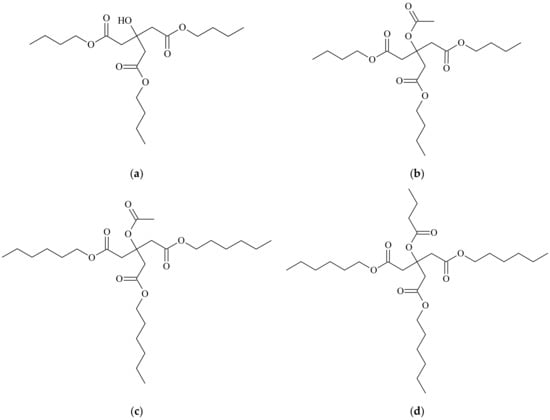 Four monomeric commercial plasticizers that are selected for this study are based on esters of citric acid, as provided by Vertellus Holdings LLC Company (Indianapolis, IN, USA), with trademark Citroflex® [41]. Their commercial and chemical names, molecular weights, and labels can be seen in Table 1. Their structure can be seen in Figure 1.