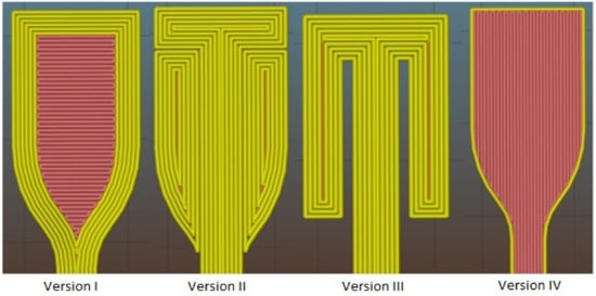 The Version I was created by simple import of fabricated model to Slic3r program and uploading to the printer. But, during the tensile test with dogbones of Version I, the delamination of perimeters occurred (illustrated by yellow color), and so the measured samples did not provide relevant results. To solve this problem, Version II was designed, where the perimeters of dogbone neck were elongated up to the upper part. The paddleboards were created from two parts. Unfortunately, during the tensile test, the defect at the point of paddleboard and neck connection occurred, because the printer created an inclusion in the paddleboard corner by releasing a large amount of melting. The inclusion acted as a disruption initiator and cracked untimely. The aim of Version III was to eliminate this problem, but the pressure of grips was not strong enough to hold the sample. The deformation then occurred in upper cross-sectional part and disagreed with real dogbone strength. The final Version (that could not be illustrated in Figure 2) was created by the combination of 10 laminas of Version I and IV, which alternate regularly (five from each Version). The delamination of the neck in its extending part was eliminated by the insertion of vertical infill (illustrated by red color) and the vertical fracture of samples was eliminated by the combination with horizontal infill.