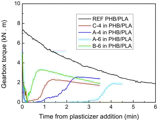 The miscibility of plasticizers with PHB/PLA polymer mixture was tested using the kneading machine PLASTI-CORDER Brabender. Citroflex® plasticizers were kneaded with PHB/PLA mixture in the weight ratio (wt %) of 60 PHB:25 PLA:15 plasticizer. Non-plasticized PHB/PLA was kneaded as a reference for the comparison (70 PHB:30 PLA). The total weight of each sample before the kneading process was 30 g. The process of kneading plasticizers with the PHB/PLA mixtures was performed at 178–180 °C (chamber temperature) at 45 rev./min, and the kneading process of reference was performed at 180 °C. The PHB/PLA mixture was dosed into the PLASTI-CORDER Brabender machine (Brabender GmbH & Co. KG, Duisburg, Germany) first and then kneaded for 1.5 min. Then, the plasticizer was added and the kneading process continued for following 3.5 min in the case of C-4, A-4 and B-6 plasticizers and for 4.5 min in the case of A-6 plasticizer. The total kneading time of PHB/PLA with plasticizers (sample dosing with kneading) was 6–7 min. The total kneading time of reference was 9 min. The gearbox torque dependence on the total plasticization time was measured and the miscibility was evaluated.