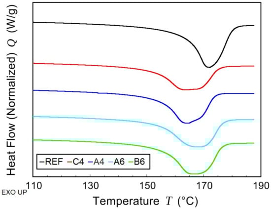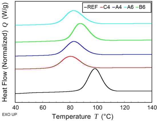 Differential scanning calorimetry (DSC)—first cooling scan of non-plasticized reference sample (REF) and PHB/PLA/Plasticizer (where the plasticizers are: C-4, A-4, B-6, and A-6).