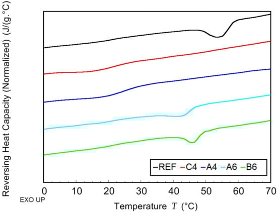 Reversing heat capacity gained from Modulated Differential Scanning Calorimetry (MDSC) scan of non-plasticized reference sample (REF) and PHB/PLA/Plasticizer (where the plasticizers are: C-4, A-4, B-6, and A-6).