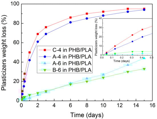 The plasticizers diffusion from PHB/PLA/plasticizer (60/25/15 in wt %) samples was evaluated as their weight loss (%) after up to 15 days of exposition to 110 °C in the drying oven.