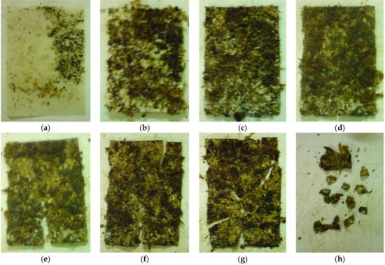 Determination of the degree of disintegration—photos of sample during the test: (a) 4th day; (b) 12th day; (c) 25th day; (d) 29th day; (e) 32nd day; (f) 35th day; (g) 42nd day; and, (h) 55th day.