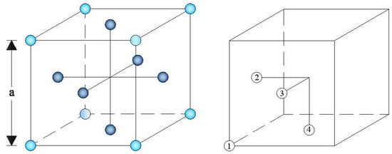 The proposed packing algorithm begins with the assignment of initial x-y-z coordinates to each sphere according to the fcc rule; the spheres are deposited in four different positions within an fcc unit cell, which are projected along the x, y, and z axes with the following coordinates: (0, 0, 0), (0, −a/2, a/2), (a/2, 0, a/2), and (a/2, −a/2, 0), respectively (Figure 2) [74]. The size a of the unit cell edge is assigned to be , in order to place the spheres as close as possible to each other.