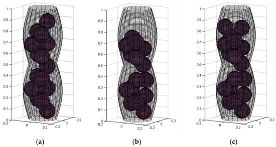 Results of the sphere packing simulation for a constricted wave channel with Dmax = 0.35, Dmin = 0.25, r = 0.07: (a) the fcc non-random disposition (N = 15 spheres, APF = 30.76%), (b) after the shaking and gravity procedures, and (c) final packing, additional spheres were aggregated (N = 17 spheres, APF = 34.87%).