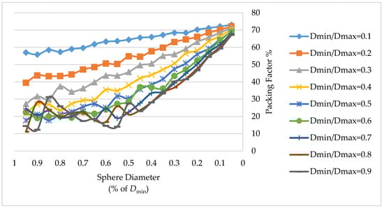 Figure 5 displays a diagram with a comparison of the results for the packing fraction in nine channels with different Dmin/Dmax ratio. It is obvious that the maximal packing efficiency is achieved for small sphere sizes. The diagrams show the sizes of the sphere along the x-axis in a descending order, and the packing fraction values in % along the y-axis.