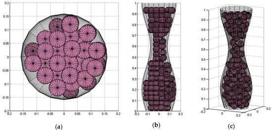 Some images of the simulated model with Dmin/Dmax = 0.5 and a sphere size of 40%Dmin are shown in Figure 6. It is important to mention that the channel and sphere dimensions were normalized in order to be able to obtain the images using the function cylinder in MATLAB®.