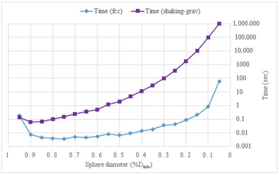 The efficiency of the simulations can be evaluated by the packing fraction reached in the channels and by the processing time used. The diagram in Figure 7 shows a comparison between the packing factor of the initial fcc configuration and the packing factor obtained after applying the shaking and gravity procedures, based on the model presented in Figure 6. Figure 8 shows the comparison in terms of processing times. When the shaking and gravity procedures were applied, the processing time for the packings with spheres of diameters smaller than 50%Dmin was very high while an increase in the packing fraction was not obtained.