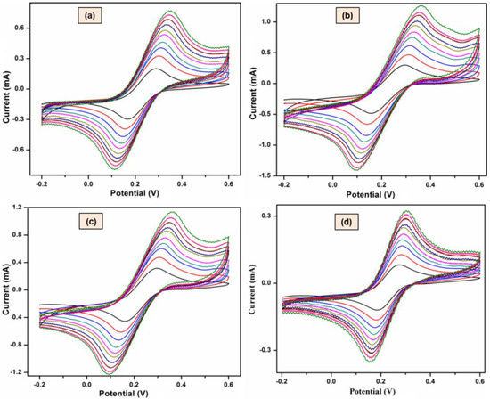 Comparison of the CVs of (a) untreated MWCNTs, (b) H2/MWCNTs, (c) NH3/MWCNTs and (d) O2/MWCNTs in 0.01 M [Fe(CN)6]3−/4− at different scan rates in the range of 10–100 mVs−1.