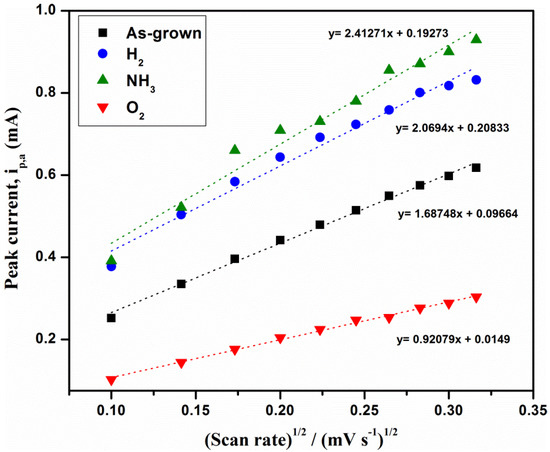 According to Equation (1), the electroactive surface area of a material is directly proportional to the peak current and thus with an increase in the surface area of the MWCNTs in our case, the peak current should be increased. From the analysis, we observed the peak current of NH3/MWCNTs to be the highest signal followed by H2/MWCNTs, bare MWCNTs and O2/MWCNTs. The observation of such order in the peak currents can further be linked to the electroactive surface areas of MWCNTs which is exactly same as the electrochemical response.