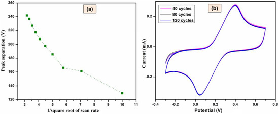 (a) Peak potential difference versus 1/square root of the scan rate, (b) multiple CVs of NH3/MWCNTs in 0.10 M KCl containing 0.01 M Fe(CN)63−/4− solution.