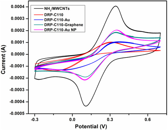 CV comparison of NH3/MWCNT electrodes and commercial Dropsens electrodes (DRP-C110, DRP-C110-Au, DRP-C110-graphene, DRP-C110 Au NPs).